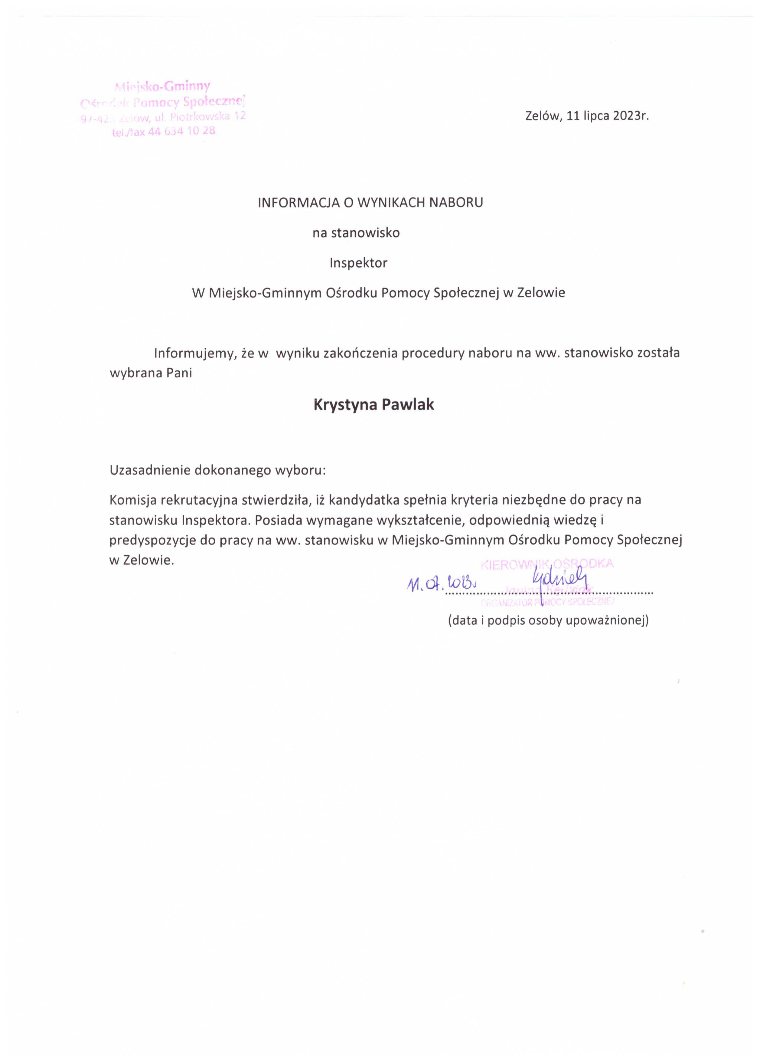Dokumenty w zamkniętej kopercie z podanym imieniem, nazwiskiem i adresem zwrotnym kandydata oraz telefonem kontaktowym, zatytułowanej „Nabór na stanowisko Inspektora” należy składać osobiście w Miejsko-Gminnym Ośrodku Pomocy Społecznej w Zelowie, ul. Piotrkowska 12, pok. 7 w terminie do 30 czerwca 2023 r. do godz. 14:00.